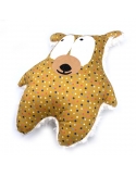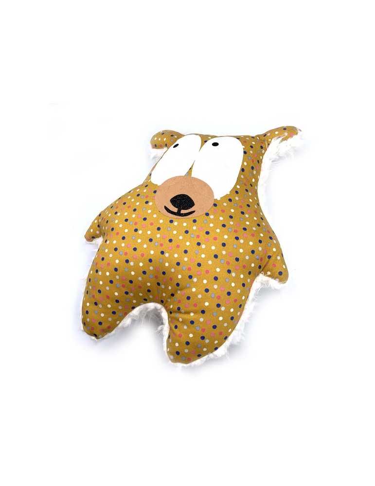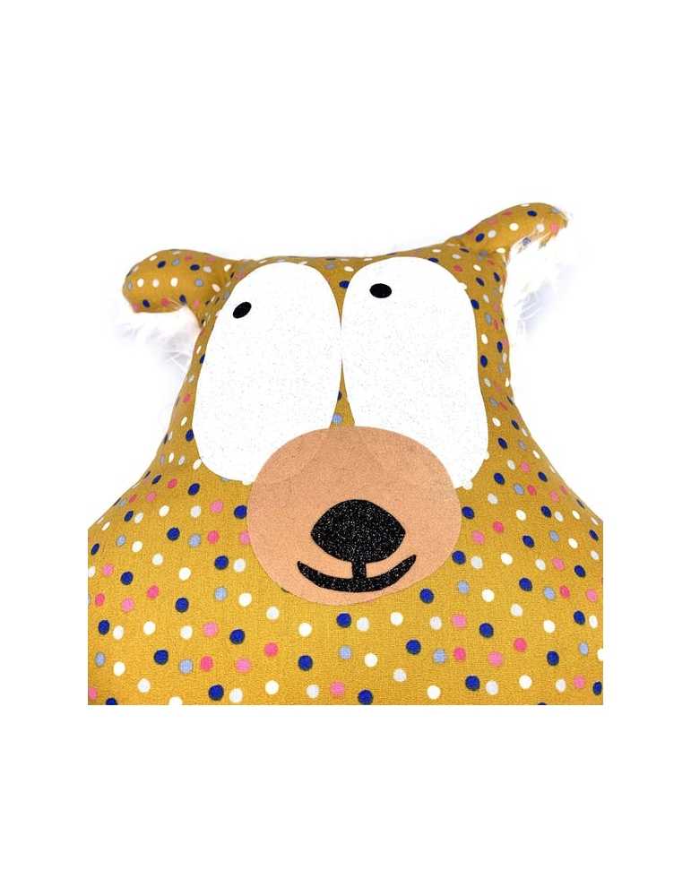 Ce coussin unique et personnalisé, en forme d'ours, a été réalisé par la créatrice de Déboutonnez moi. Son recto est composé d'un tissu coton avec des yeux en flocage pailleté. Le verso est en fourrure synthétique.