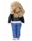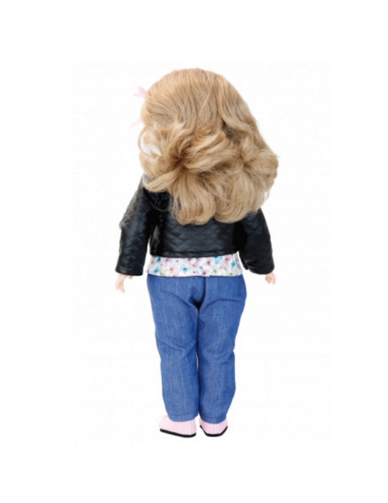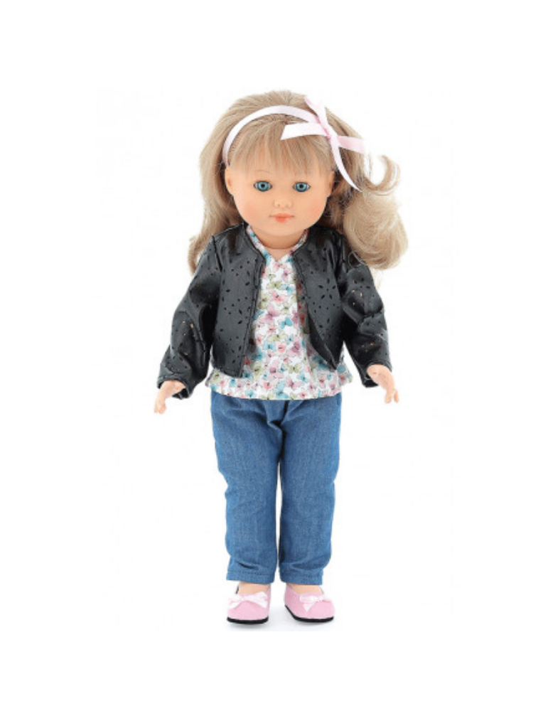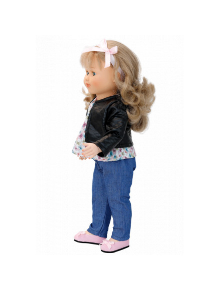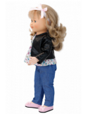 Sa tenue se compose d'un jean, d'un maillot fleuri, d'un blouson noir, d'un bandeau et d'une paire de chaussures roses.