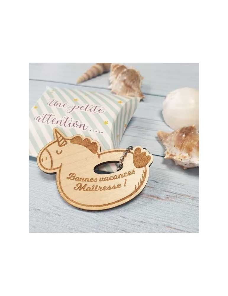Porte clés en bois licorne gravé Bonnes vacances Maîtresse - Cadeau maîtresse