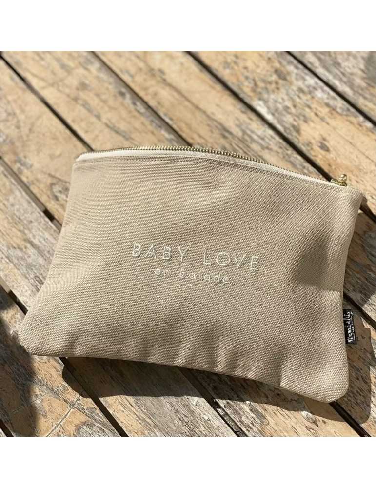 Adorable trousse brodée " Baby Love en Balade" couleur safari pour partir avec Bébé en balade, confectionnée avec une jolie toile de coton et entièrement doublée en coton écru.